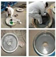 双组分,以特种金属碳化物、纳米复合超硬颗粒为骨材、DNI-PDMG预聚体为基础的耐磨复合材料,具有超强耐磨性、柔韧性、耐水、耐油、耐酸碱性。适用(-60℃-120℃)恶略环境中设备过流冲蚀(颗粒大于50mm)、设备的局部修复、设备预涂耐磨层,如旋流器、浮选柱、浮选机、泡沫槽、分级机、搅拌桶、溜槽、管件类、渣浆泵、脱硫泵、污水泵、往复泵、隔膜泵等泵类修复。
